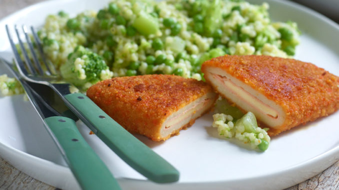 Cordons bleus végétariens, blé aux brocolis et aux petits pois
