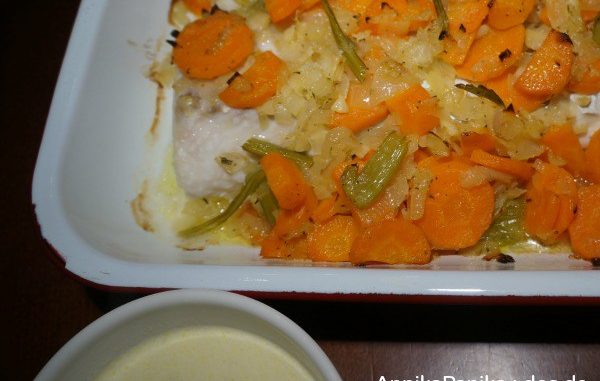 Mettre le four à 190°. Rincez le dos de cabillaud et séchez le. Mettre un peu d’huile d’olive dans un plat allant au four. Poser le dos de cabillaud dans le plat, saler et mettre les légumes de la sauce par dessus pour le couvrir.