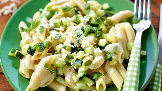 Pendant ce temps, taillez les courgettes non épluchées en petits dés. Faites-les revenir à feu modéré dans une grande sauteuse contenant l’huile. Ajoutez les gousses d’ail pressées et mélangez régulièrement ; elles doivent rester un peu croquantes.