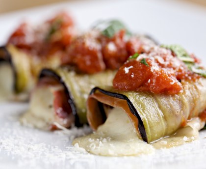 6. Mettre une tranche de jambon sur chaque tranche d'aubergine. Placer un bâtonnet de mozzarella à l'extrémité de chaque tranche. Roulez les tranches d'aubergines tapissées de jambon autour du fromage.